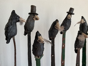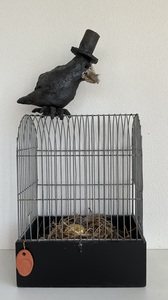 De stoere vogels, veelal roeken, staan vaak op een standaard en hebben een zacht veertje in hun snavel.